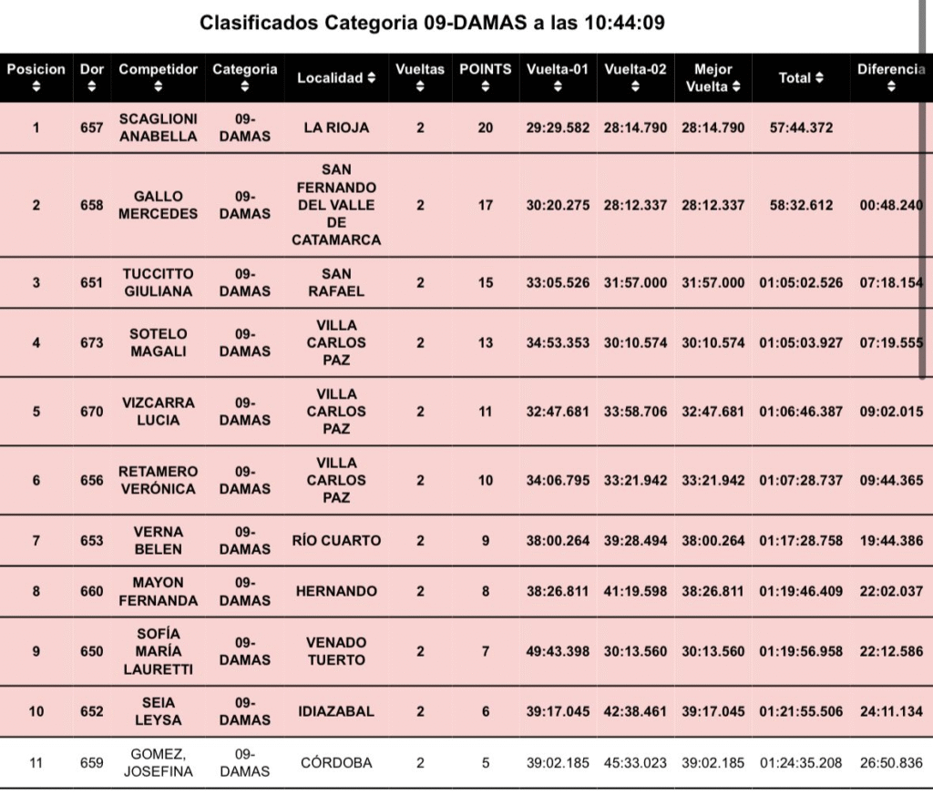 En detalle, la representante de La Rioja registró 29:29.582 en la primera vuelta y mejoró aún más en el segundo giro, con un tiempo de 28:14.790, demostrando regularidad y contundencia en el circuito.